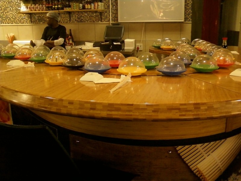 Oh this sushi table gets me! You can sit down for a minute and chose what you'd like to eat from the little, brightly coloured sushi bowls that go past you on the conveyor track. I could use one of these to put different bits of fruit on and munch randomly from! Would you like some raw fish to nibble on?